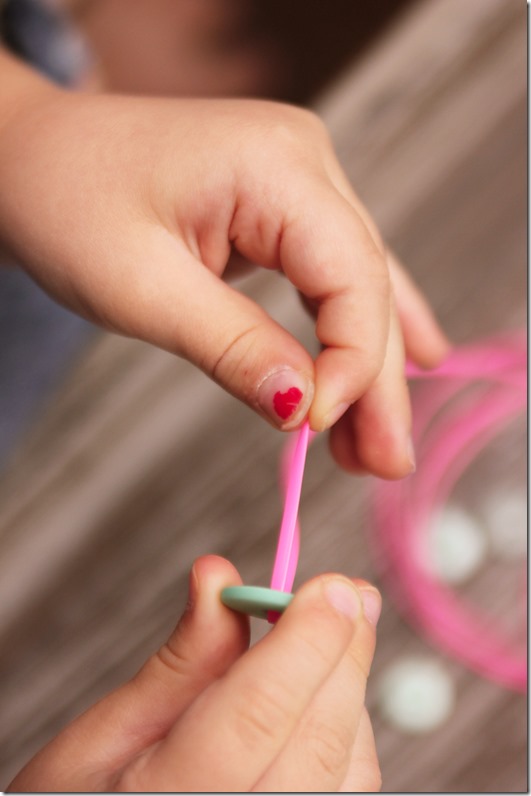 - Have your child thread the the buttons on the plastic lacing in their desired pattern/design.